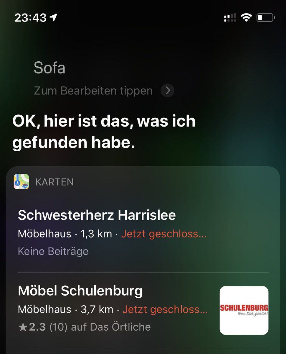 Bei #Siri gab es offenbar serverseitig irgendwelche Updates. Seit dem Wochenende wird durch die Anweisung „Sofa“ eine Suche gestartet, statt wie zuvor meine HomeKit Szene zu starten. 😒