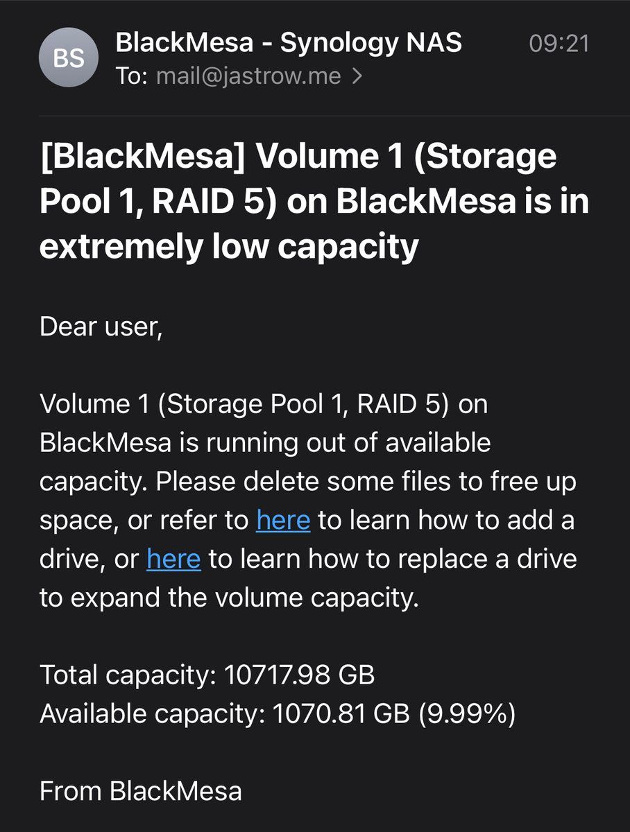 Das NAS übertreibt auch ein wenig… 1TB ist jetzt nicht “extremely low on storage” 🙄